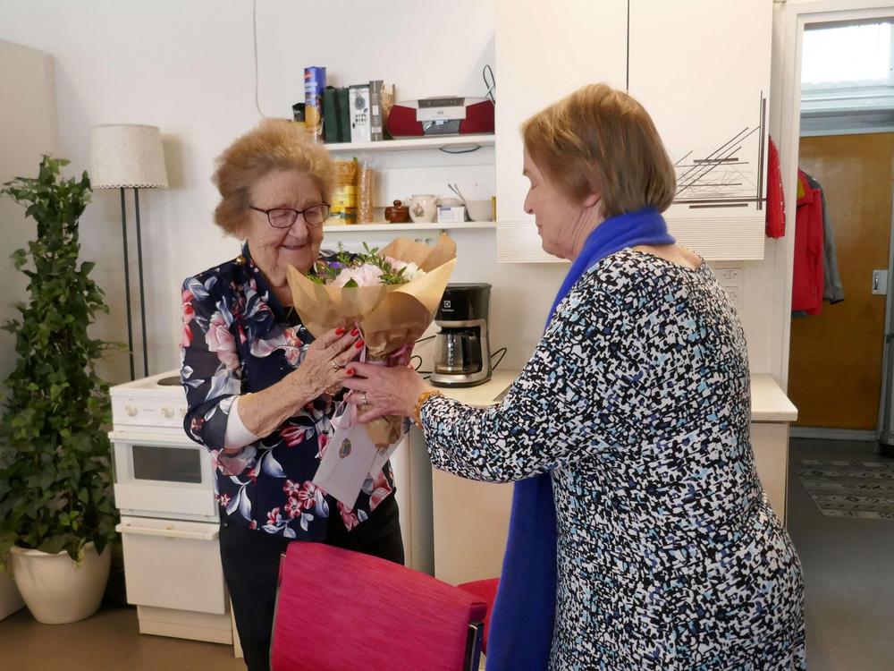 Kirjallisuuskerhon vetäjä Annalle ojennettiin kukat kiitokseksi tästä kaudesta.